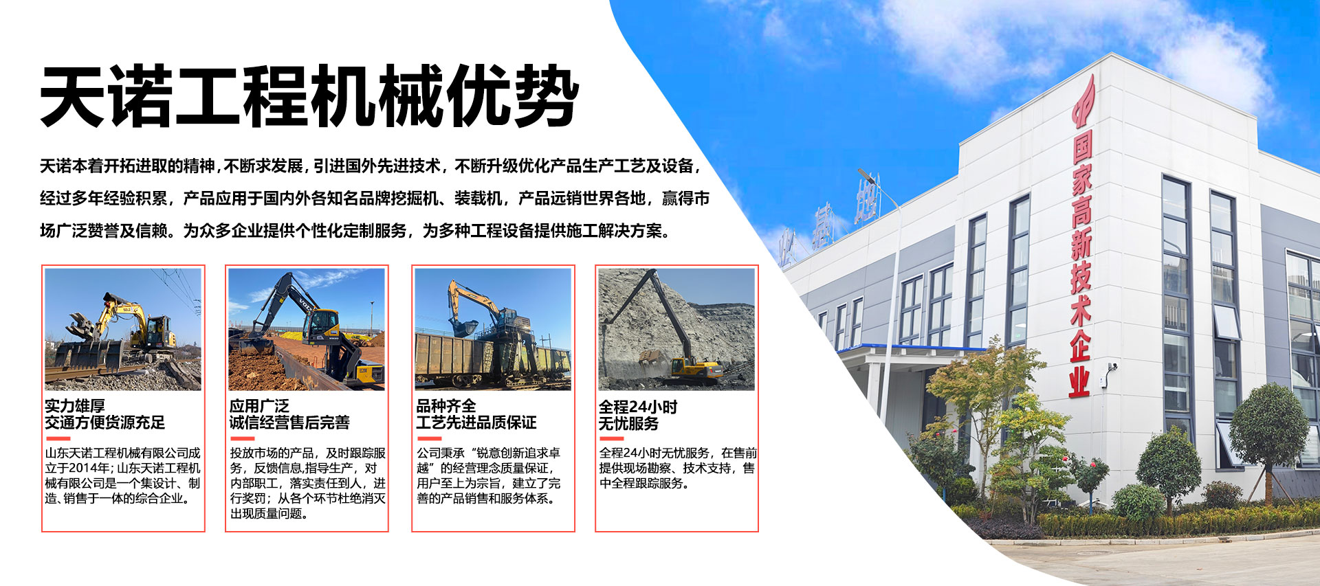 山東天諾工程機械有限公司成立于2014年;天諾工程機械是一個集設計、制造、銷售于一體的綜合企業,生產產品適配各種工程機械設備,主要有:鐵路換枕機改裝,挖掘機升高底盤,挖掘機駕駛室升降,加長臂、三節臂、打樁臂、巖石臂定制,多型號挖斗鏟斗定制,裝載機防滑履帶,多種類鐵路維護屬具等產品。
